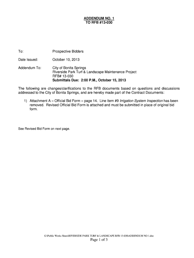 This document serves as an addendum to RFB #13-030, providing changes and clarifications regarding the Riverside Park Turf & Landscape Maintenance Project and the revised bid form requirements.