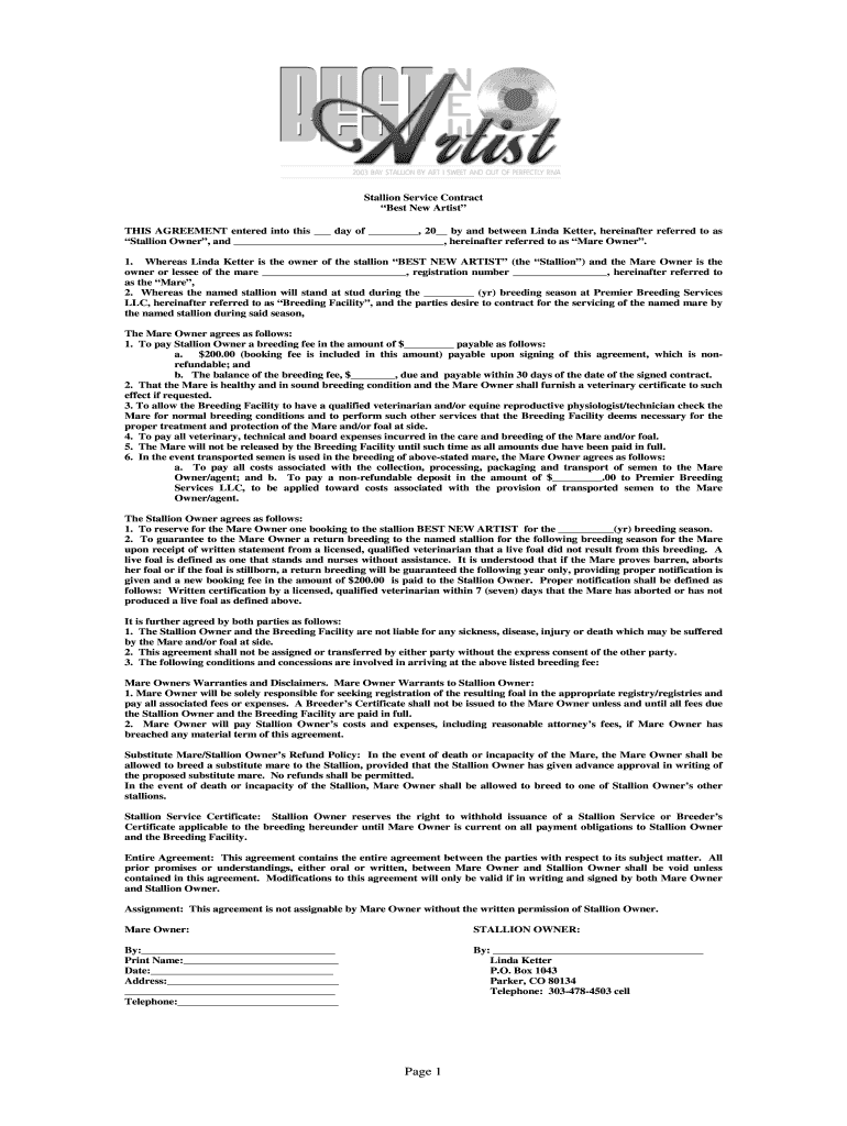 Stallion Service Contract Best New Artist THIS AGREEMENT entered into this day of, 20 by and between Linda Better, hereinafter referred to as Stallion Owner, and, hereinafter referred to as Mare Owner.