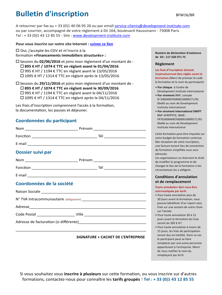 Bulletin d 'inscription BFW16×BR A returner par fax Au + 33 ×0×1 40 06 95 26 of par email service clients developmentinstitute.com of par courier, accompany DE vote element Did 164, boulevard Hauptmann