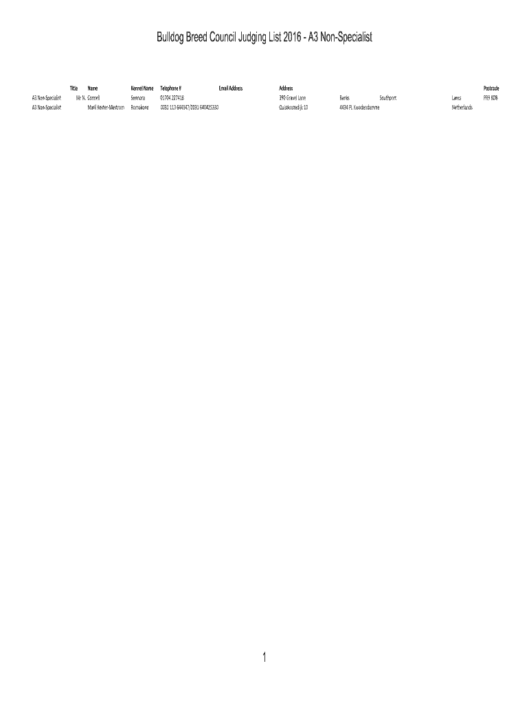 Bulldog Breed Council Judging List 2016 A3 Nonspecialist A3 Nonspecialist A3 Nonspecialist Title Name Mr N. Connell Mail KosterMestrom Kennel Name Sonora Romaine Telephone # Email Address 01704 227418
