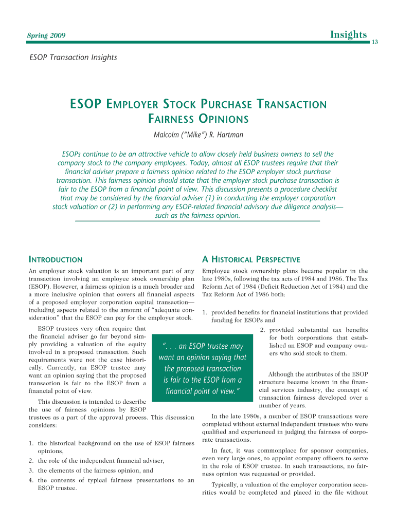 Insights Spring 2009 ESOP Transaction Insights ESOP EMPLOYER STOCK PURCHASE TRANSACTION FAIRNESS OPINIONS Malcolm (Mike) R. Hartman Sops continue to be an attractive vehicle to allow closely held