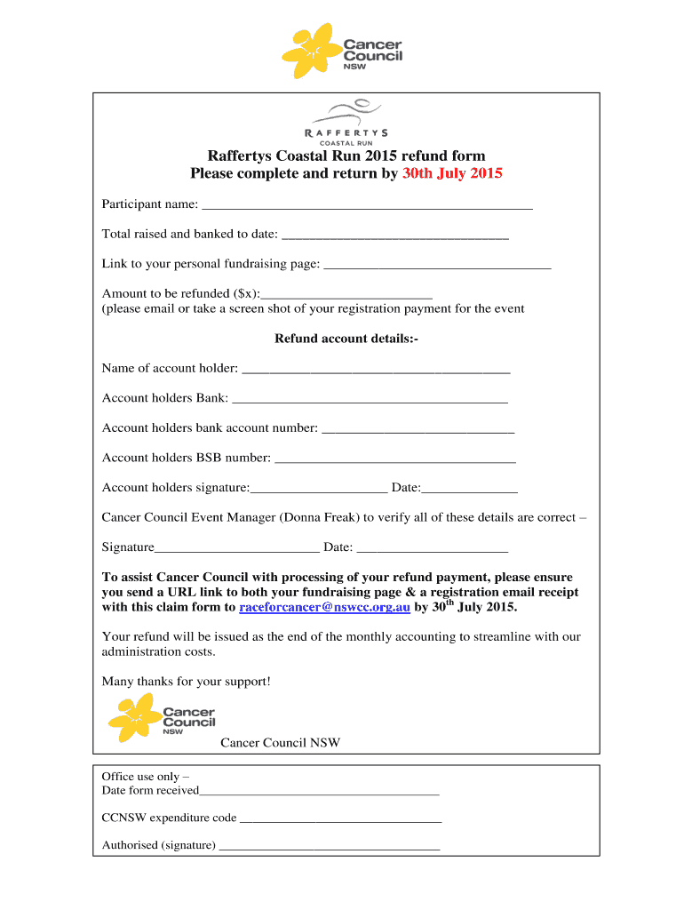 Affects Coastal Run 2015 refund form Please complete and return by 30th July 2015 Participant name: Total raised and banked to date: Link to your personal fundraising page: Amount to be refunded (ex):