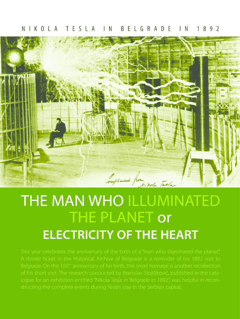 This document commemorates the 150th anniversary of Nikola Tesla's birth and highlights his significant visit to Belgrade in 1892, detailing his contributions to science and the acknowledgment he