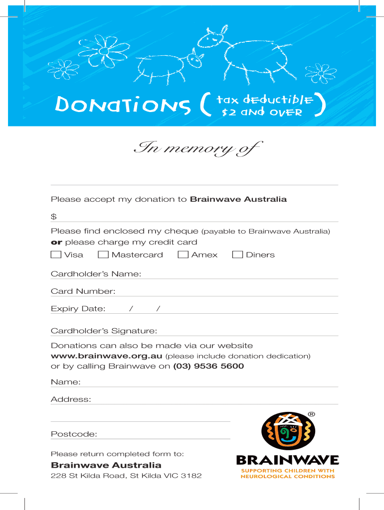 In memory of Please accept my donation to brainwave×b Australia $ Please find enclosed my check×payable to brainwave×b Australia), or please charge my credit card