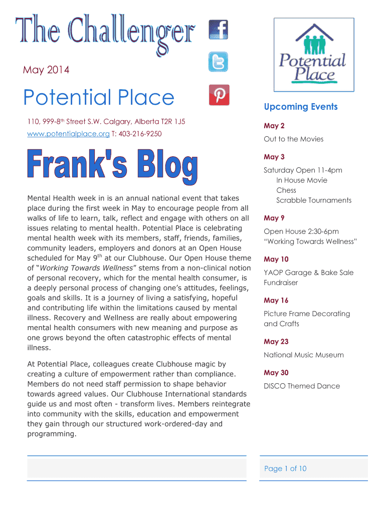 May 2014 Potential Place 110, 9998th Street S.W. Calgary, Alberta T2R 1J5 www.potentialplace.org T: 4032169250 Upcoming Events May 2 Out to the Movies May 3 Mental Health week in is an annual national