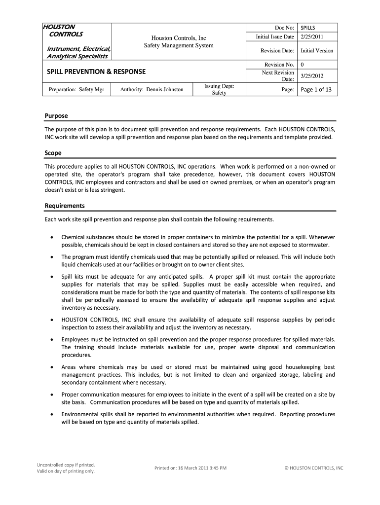 HOUSTON CONTROLS Instrument, Electrical, Analytical Specialists Doc No: Houston Controls, Inc Safety Management System 2×25/2011 Authority: Dennis Johnston Revision Date: Initial Version Revision