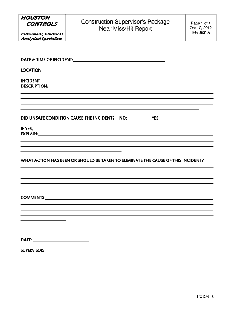 HOUSTON CONTROLS Instrument, Electrical Analytical Specialists Construction Supervisors Package Near Miss×Hit Report Page 1 of 1 Oct 12, 2010 Revision A DATE & TIME OF INCIDENT: LOCATION: INCIDENT