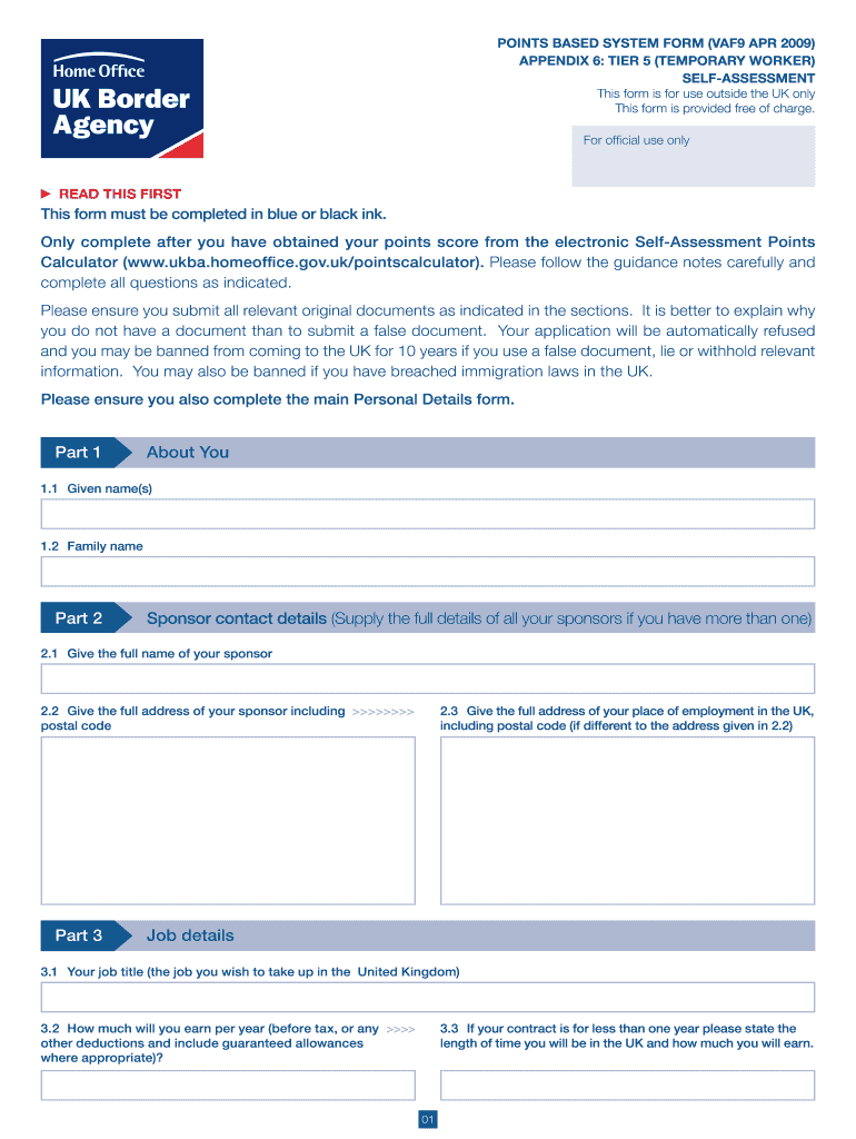 POINTS BASED SYSTEM FORM (VAF9 APR 2009) APPENDIX 6: TIER 5 (TEMPORARY WORKER) SELF-ASSESSMENT This form is for use outside the UK only This form is provided free of charge. For official use only