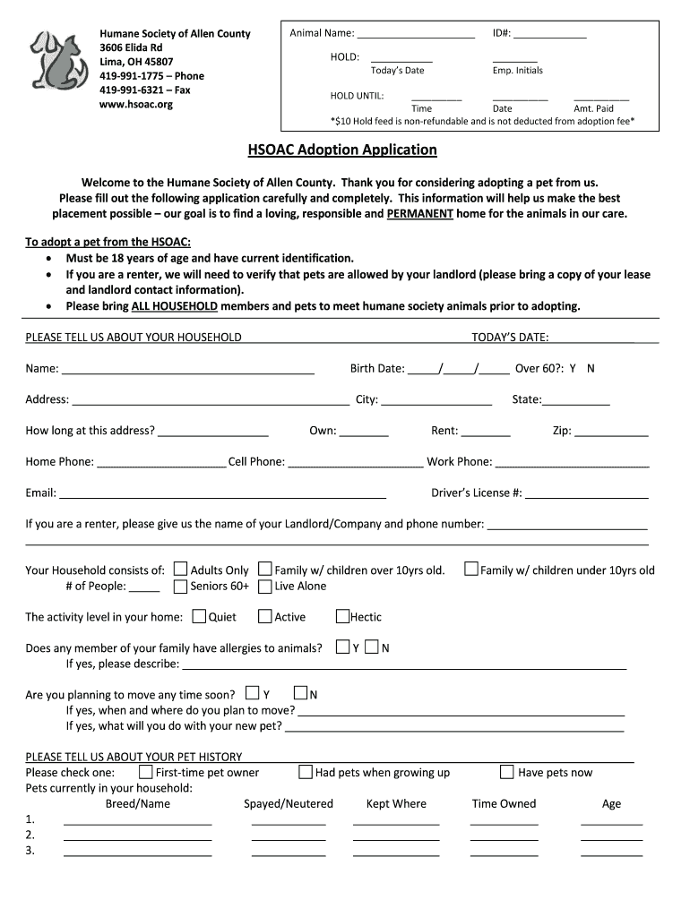 Humane Society of Allen County 3606 Eliza Rd Lima, OH 45807 4199911775 Phone 4199916321 Fax www.hsoac.org Animal Name: HOLD: ID#: Today's Date EMP. Initials HOLD UNTIL: Time Date Amt. Paid *$10 Hold