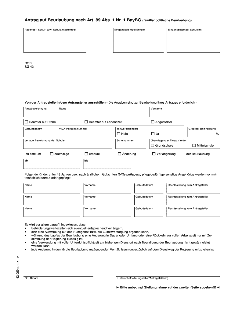 Ant rag AUF Beurlaubung each Art. 89 Abs. 1 NR. 1 Being (familienpolitische Beurlaubung) Ab sender: Schulz BMW. Schulamtsstempel Eingangsstempel Schulz Eingangsstempel Schulman ROB SG 43 On her Antragstellerin×them