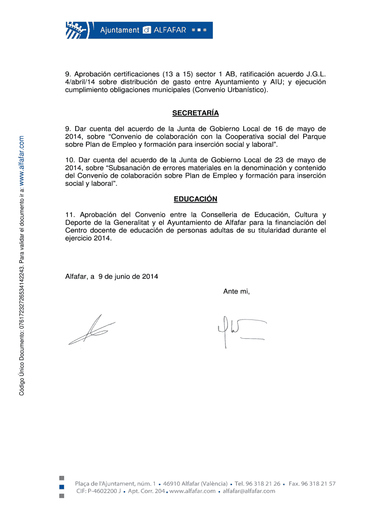 SECRETARIAT Cargo Nico Document: 07617232726534142243. Para valid El document IR a: www.alfafar.com RESIN EXTRAORDINARY DEL AYUNTAMIENTO CORRESPONDENCE AL DID 12 DE JUNIOR DE 2014. LENO SECRET NM.