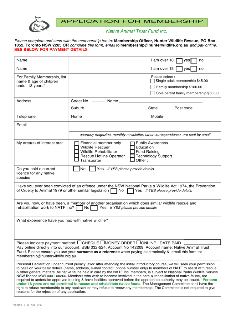 APPLICATION FOR MEMBERSHIP Native Animal Trust Fund Inc. Please complete and send with the membership fee to: Membership Officer, Hunter Wildlife Rescue, PO Box 1052, Toronto NSW 2283 OR complete