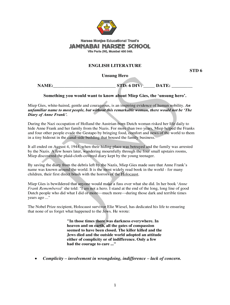 ENGLISH LITERATURE STD 6 Unsung Hero NAME: STD: 6 DIV: DATE: Something you would want to know about Main Gives, the unsung hero. Main Gives, white haired, gentle and courageous, is an inspiring evidence