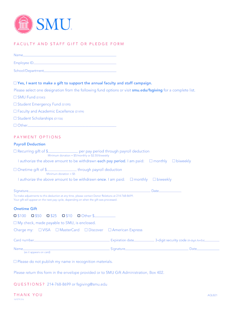 FACULTY AND STAFF GIFT OR PLEDGE FORM Name Employee ID School×Department Yes, I want to make a gift to support the annual faculty and staff campaign. Please select one designation from the following