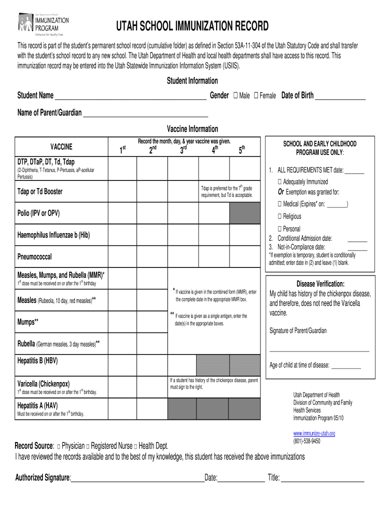 The Utah School Immunization Record is a medical consent form used by parents and guardians to document the immunization history of students enrolling in schools in Utah.