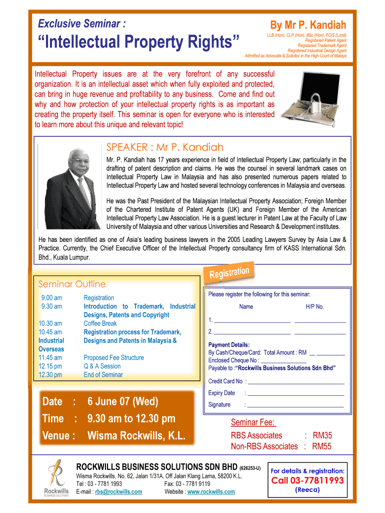 Registration form for a seminar conducted by Mr. P. Kandiah on Intellectual Property Rights, focusing on the importance of protecting intellectual assets for business success.