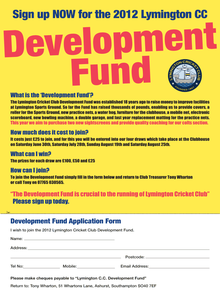 Sign up NOW for the 2012 Lexington CC E moment Dave Fund What is the Development Fund? The Lexington Cricket Club Development Fund was established 18 years ago to raise money to improve facilities