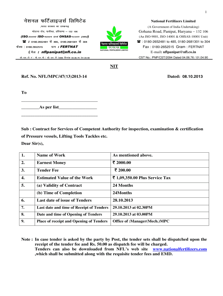 How to fill out NIT Ref No. NFL/MPC/47(13)2013-14