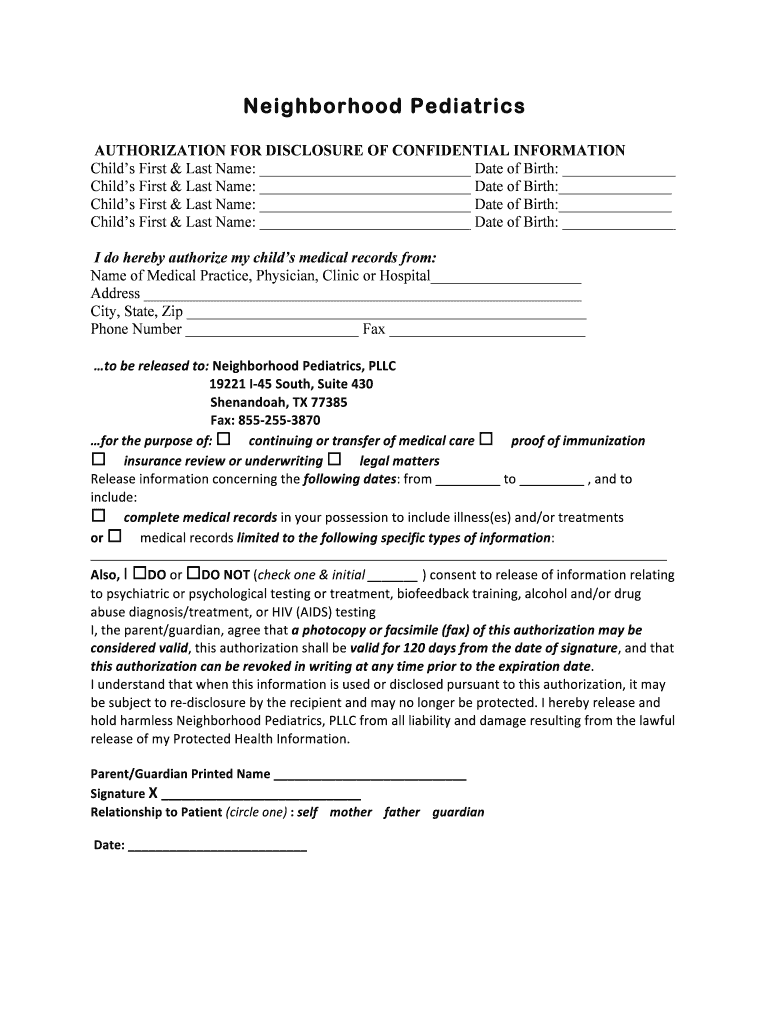Neighborhood Pediatrics AUTHORIZATION FOR DISCLOSURE OF CONFIDENTIAL INFORMATION Child's First & Last Name: Date of Birth: Child's First & Last Name: Date of Birth: Child's First & Last Name: Date