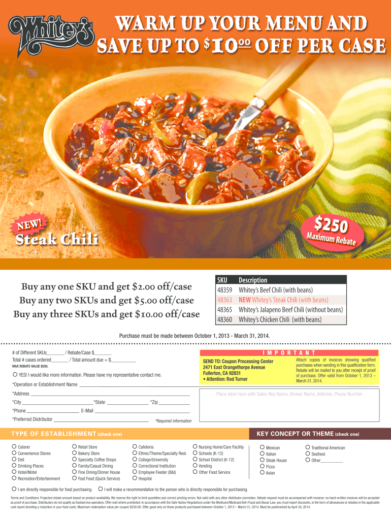 Buy any one SKU and get $2.00 off×case Buy any two SKUs and get $5.00 off×case Buy any three SKUs and get $10.00 off×case SKU 48359 48363 48365 48360 Description Whiteys Beef Chili (with beans)