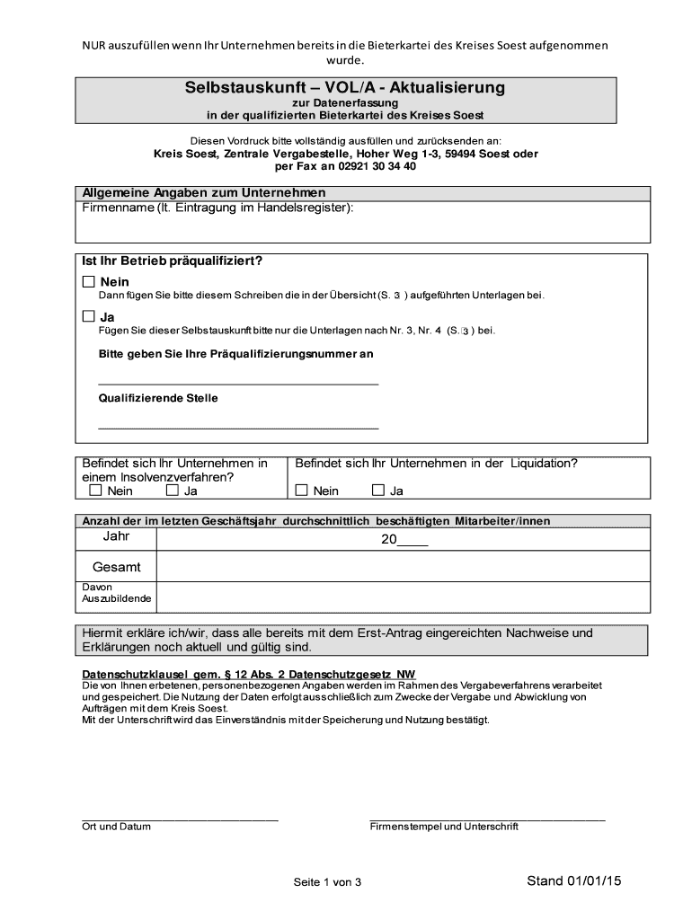 OUR auszufllen went ICR Unternehmen berates in die Bieterkartei DES Erases Sorest aufgenommen were. Selbstauskunft VOL×A Aktualisierung our Datenerfassung in her qualifizierten Bieterkartei DES Erases