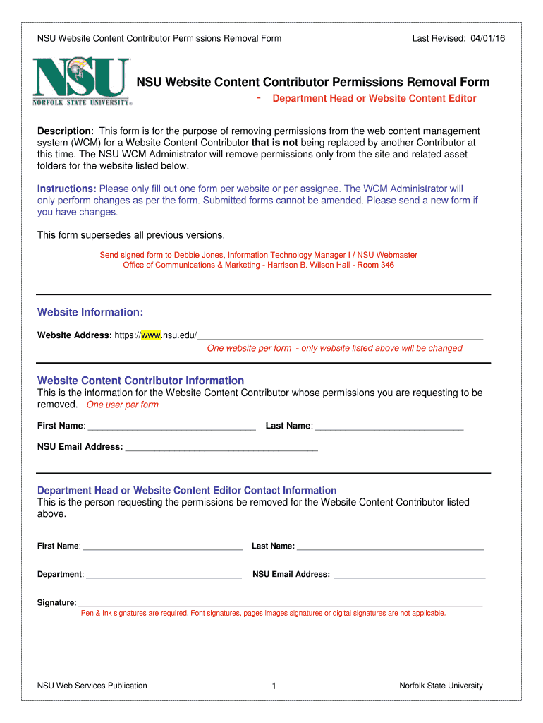 NSU Website Content Contributor Permissions Removal Form Last Revised: 04×01/16 NSU Website Content Contributor Permissions Removal Form Department Head or Website Content Editor Description: This