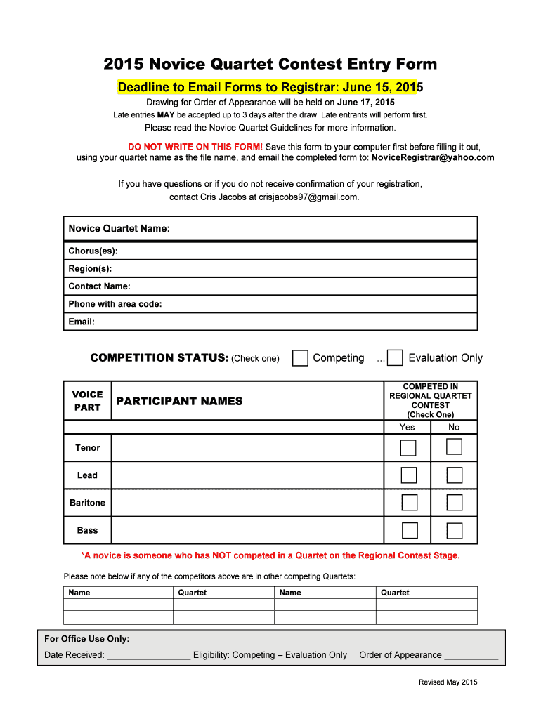 2015 Novice Quartet Contest Entry Form Deadline to Email Forms to Registrar: June 15, 2015, Drawing for Order of Appearance will be held on June 17, 2015, Late entries MAY be accepted up to 3 days