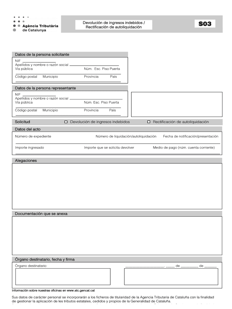 S03 Devolution DE ingress underbids / Rectification de autoliquidacin Dates DE la persona solicit ante NIF Spellings y hombre o ran social Va public Nm. Esc. Peso Puerto Cargo postal Provincial Municipal