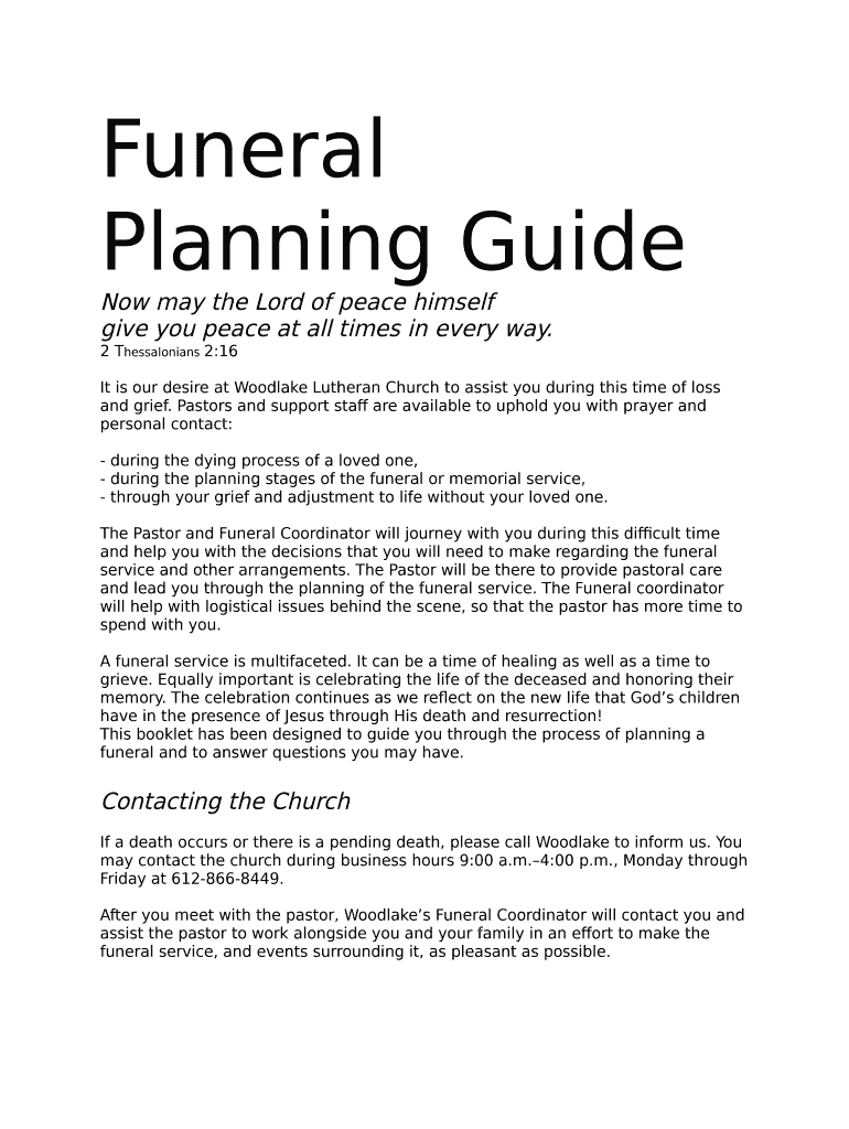 Funeral Planning Guide Now may the Lord of peace himself give you peace at all times in every way. 2 Thessalonians 2:16It is our desire at Wood lake Lutheran Church to assist you during this time