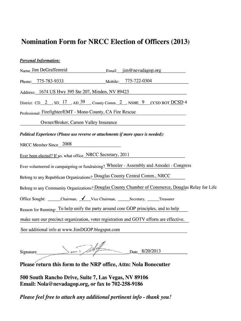 Get the free Nomination Form for NRCC Election of Officers 2013 - nevadagop