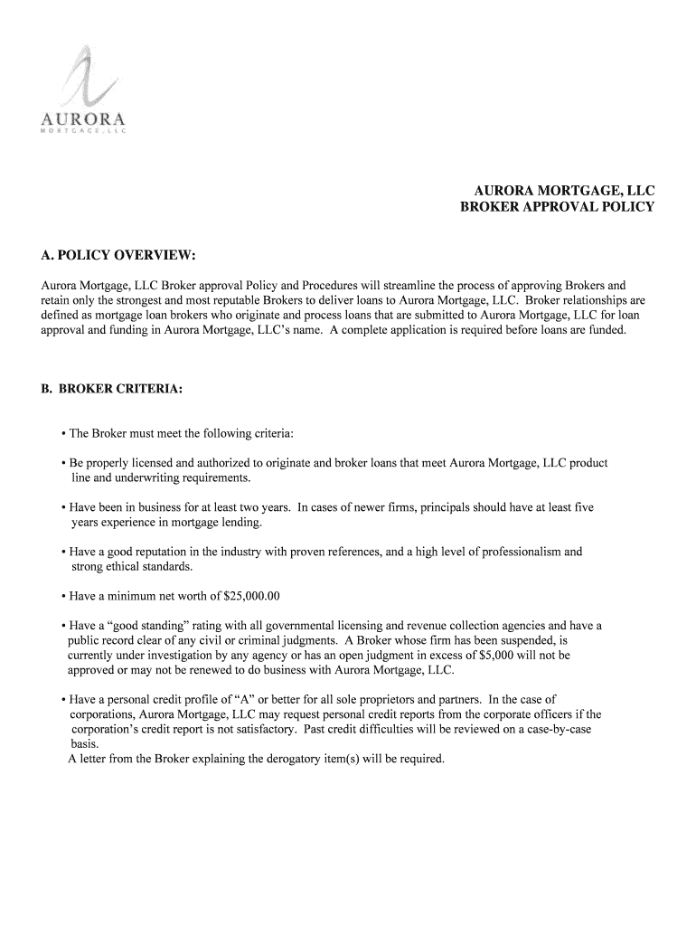 AURORA MORTGAGE, LLC BROKER APPROVAL POLICY A. POLICY OVERVIEW: Aurora Mortgage, LLC Broker approval Policy and Procedures will streamline the process of approving Brokers and retain only the strongest