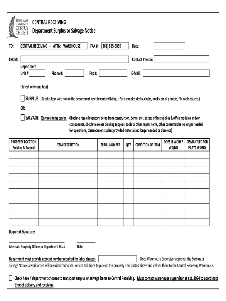 CENTRAL RECEIVING Department Surplus or Salvage Notice TO: CENTRAL RECEIVING ATTN: WAREHOUSE FAX #: (361) 825-5859 Date: FROM: Contact Person: Department Unit # Phone #: Fax #: E-Mail: (Select only