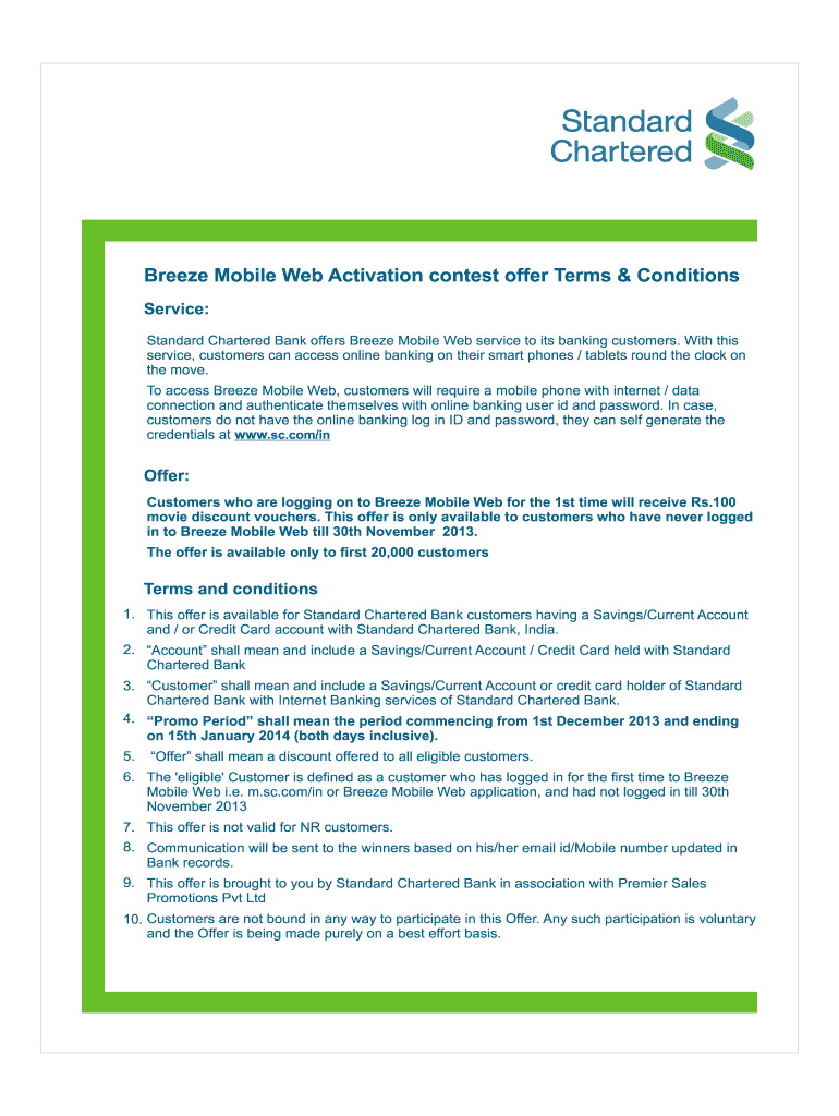This document outlines the terms and conditions for the Breeze Mobile Web service activation contest, including the eligibility criteria, offer details, and specific terms for redeeming movie discount