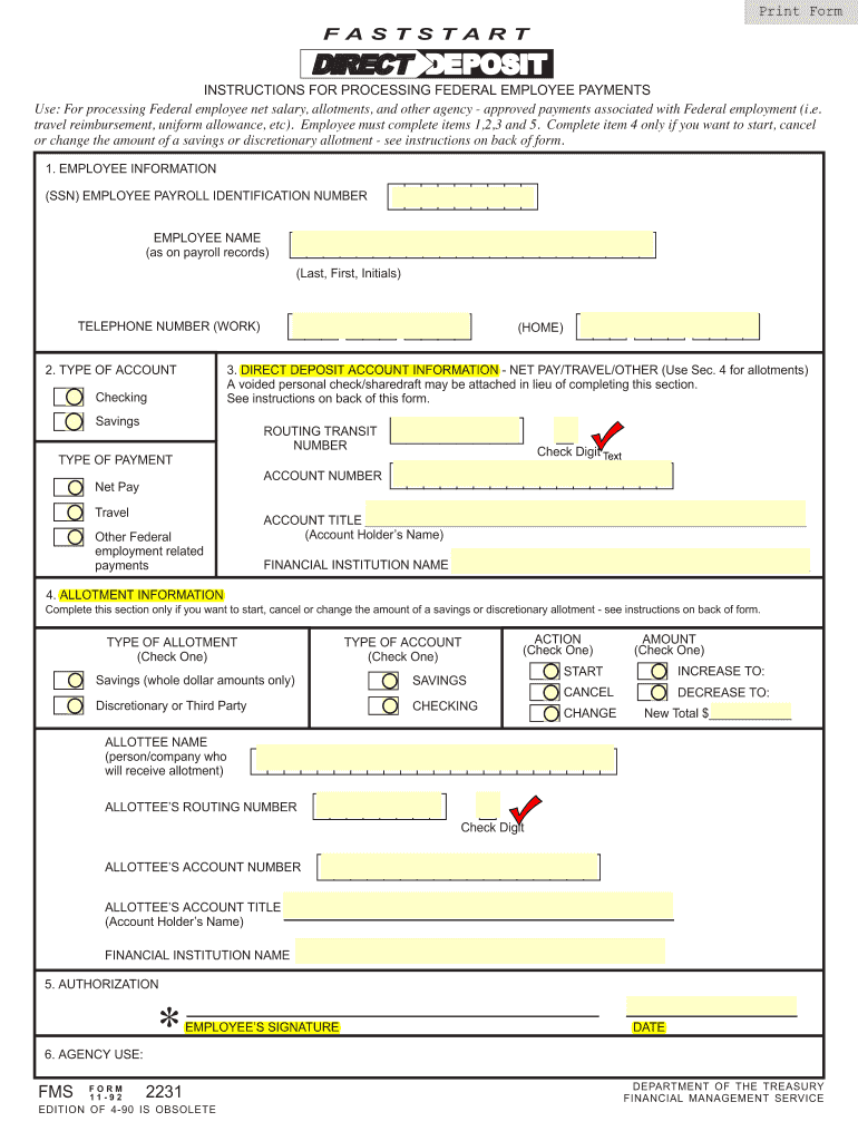 The US Federal FastStart Direct Deposit Form is a government document used by federal employees to provide instructions for processing their net salary and allotments.