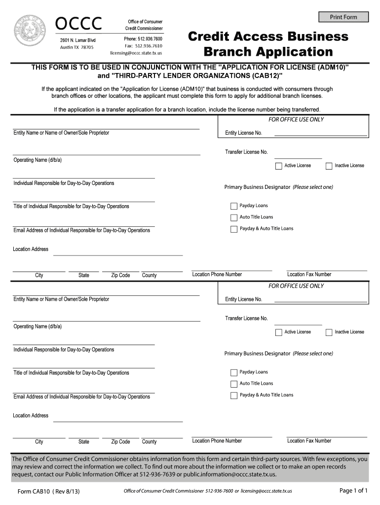 This form is to be used for applying for additional branch licenses for Credit Access Businesses that conduct business with consumers through branch offices or other locations.