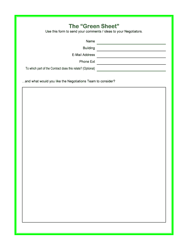 The Green Sheet Use this form to send your comments / ideas to your Negotiators. Name Building Email Address Phone Ext To which part of the Contract does this relate? (Optional) ...and what would