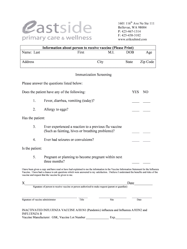 1601 116th Ave Ne Ste 111 Bellevue, WA 98004 P: 4254671314 F: 4254583102 www.eriksuhmd.com Information about person to receive vaccine (Please Print) Name: Last First M.I. DOB Address City Age State