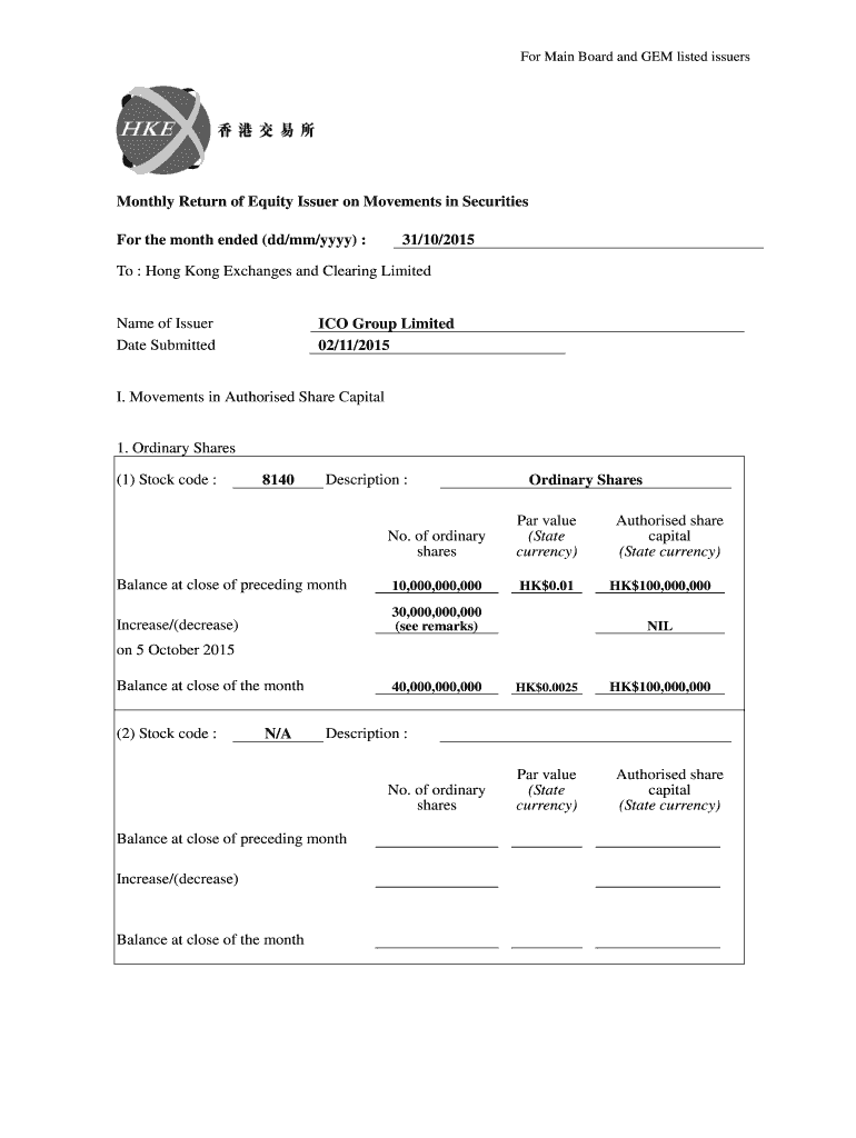 For Main Board and GEM listed issuers Monthly Return of Equity Issuer on Movements in Securities For the month ended (dd×mm/YYY) : 31×10/2015 To : Hong Kong Exchanges and Clearing Limited Name of