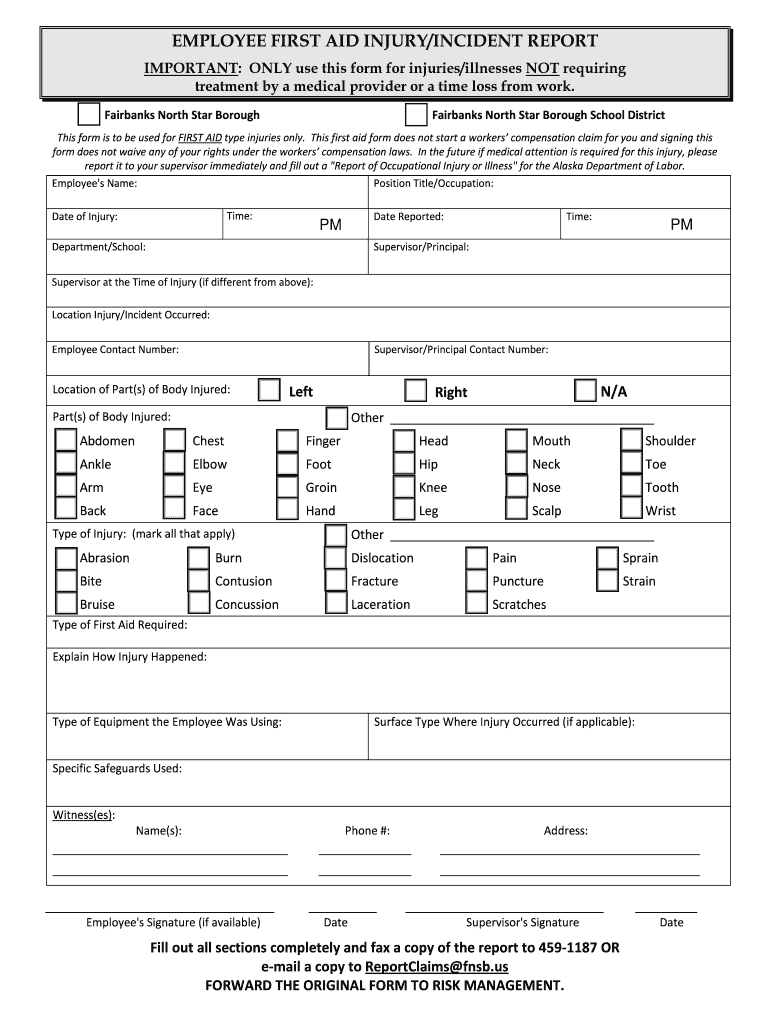 The Employee First Aid Injury Incident Report is a workplace document used by Fairbanks North Star Borough School District employees to report non-emergency injuries or illnesses.