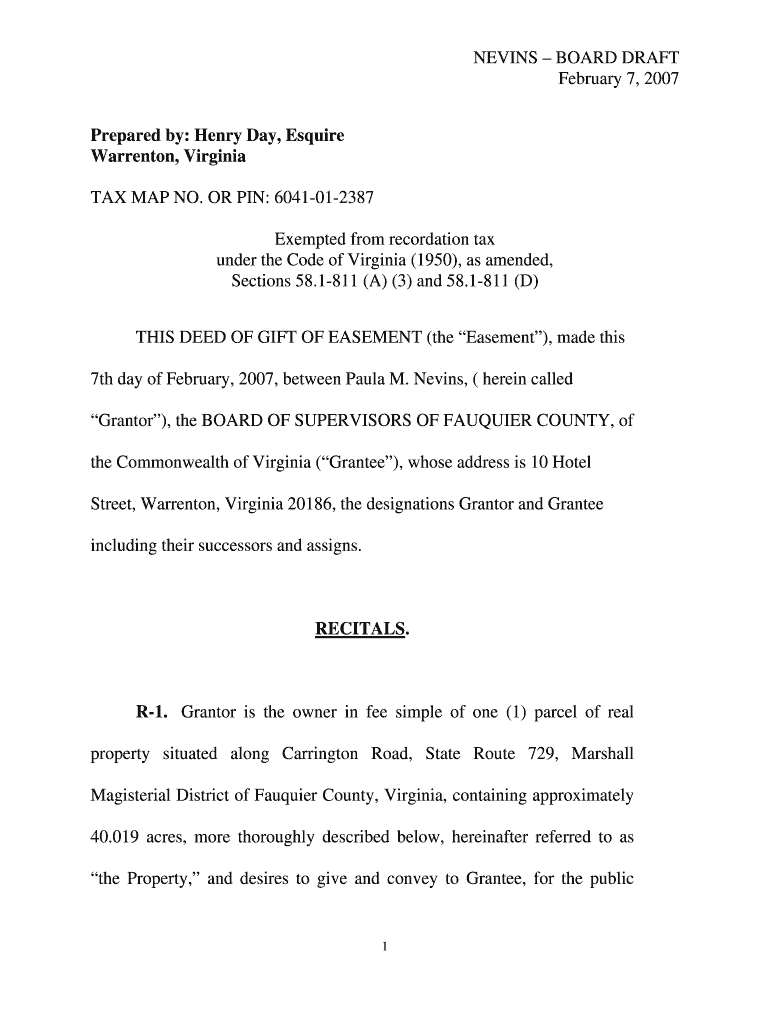 This document is a legal agreement between Paula M. Nevins and the Board of Supervisors of Fauquier County, conveying a perpetual conservation and open-space easement over a parcel of real property