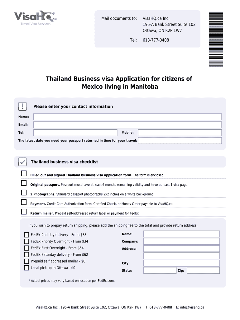 Mail documents to: Tel: Visa HQ.ca Inc. 195A Bank Street Suite 102 Ottawa, ON K2P 1W7 6137770408 Thailand Business visa Application for citizens of Mexico living in Manitoba Please enter your contact
