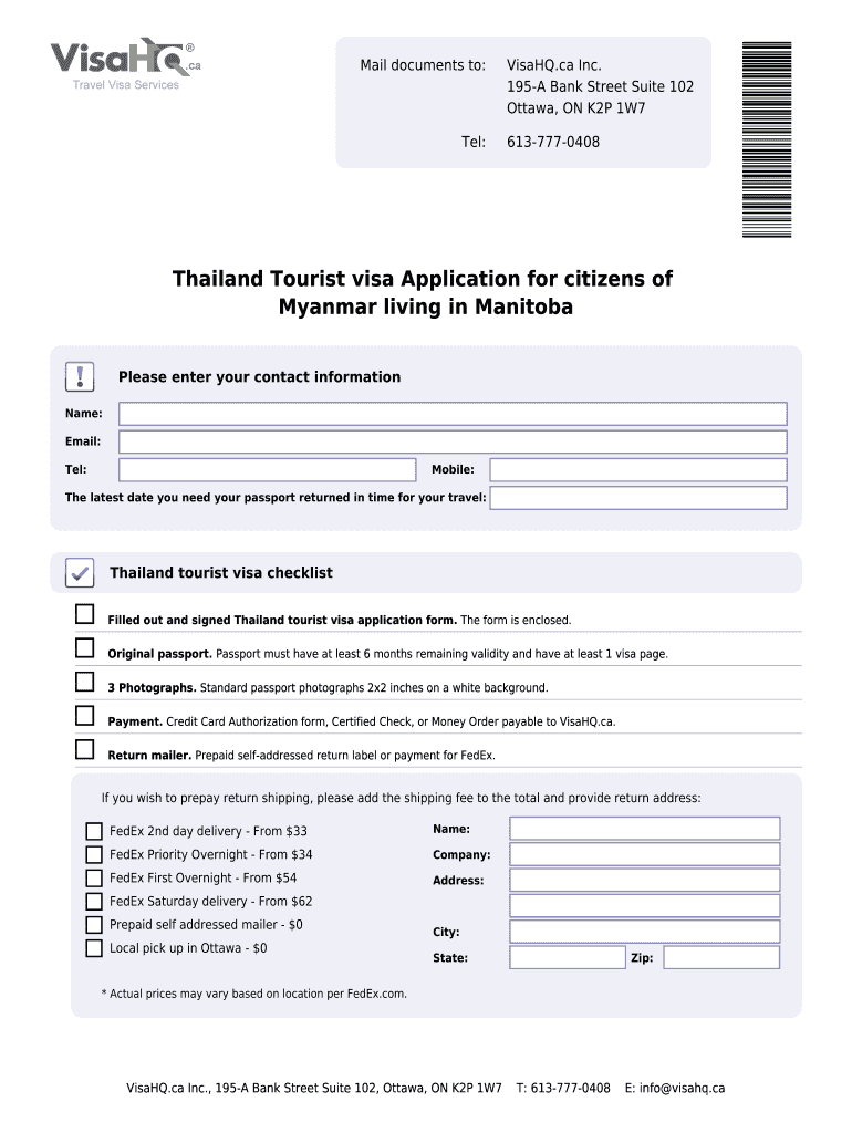 Mail documents to: Tel: Visa HQ.ca Inc. 195A Bank Street Suite 102 Ottawa, ON K2P 1W7 6137770408 Thailand Tourist visa Application for citizens of Myanmar living in Manitoba Please enter your contact
