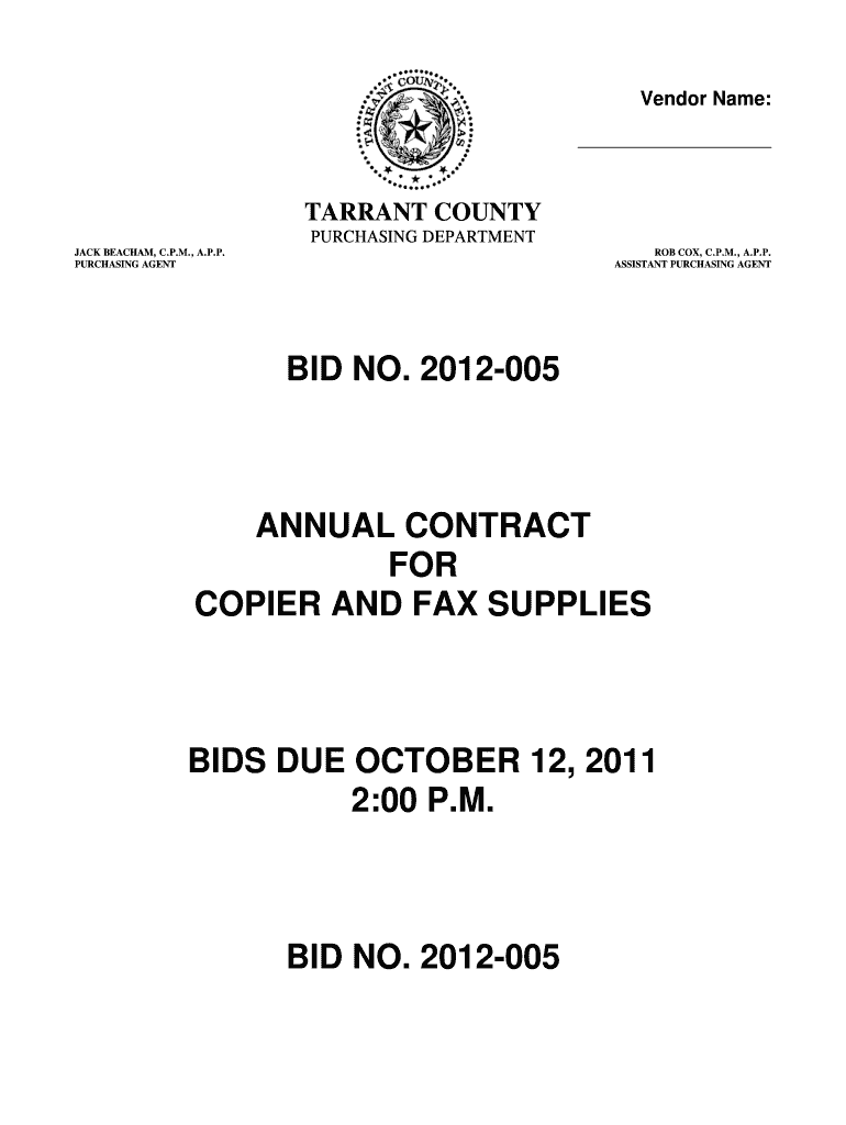This document outlines the bid specifications and conditions for submitting proposals to Tarrant County for an annual contract to supply copier and fax materials.