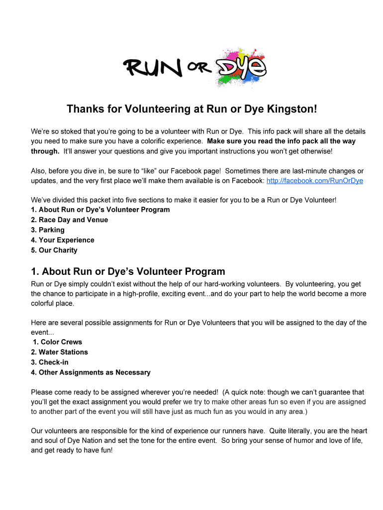 Thanks for Volunteering at Run or Dye Kingston! Were so stoked that you're going to be a volunteer with Run or Dye. This info pack will ...