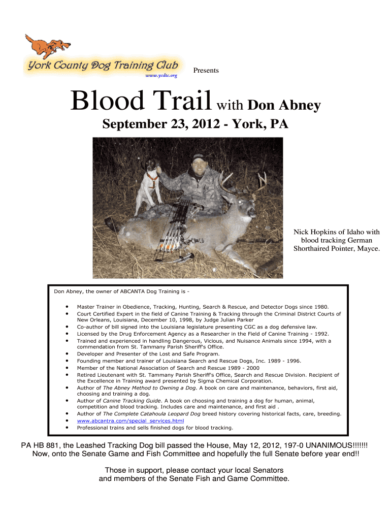 Get the free YCDTC ABNEY blood trail Seminar - York County Dog Training Club - ycdtc