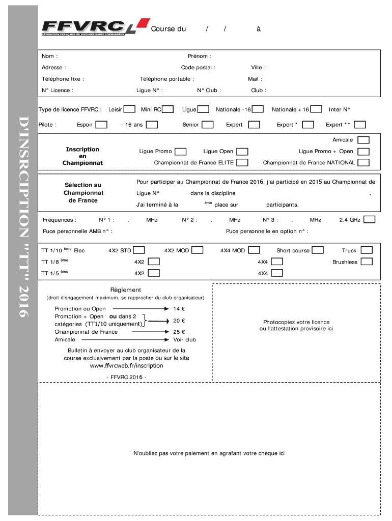 Course Du Not : / / Prom : Address : Code postal : Tl phone fine : Tl phone portable : N License : Life N : Type DE license FFV RC : D 'INSCRIPTION “TT 2016 Pilot : Villa : Lois Despair Mail : N