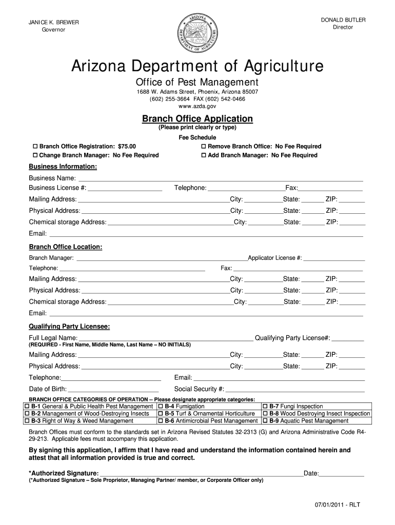 Application form for registering a branch office with the Arizona Department of Agriculture's Office of Pest Management.