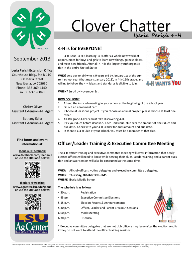This document provides information about the Iberia Parish 4-H program, including enrollment details, event information, and club activities for youth interested in 4-H. It highlights the benefits