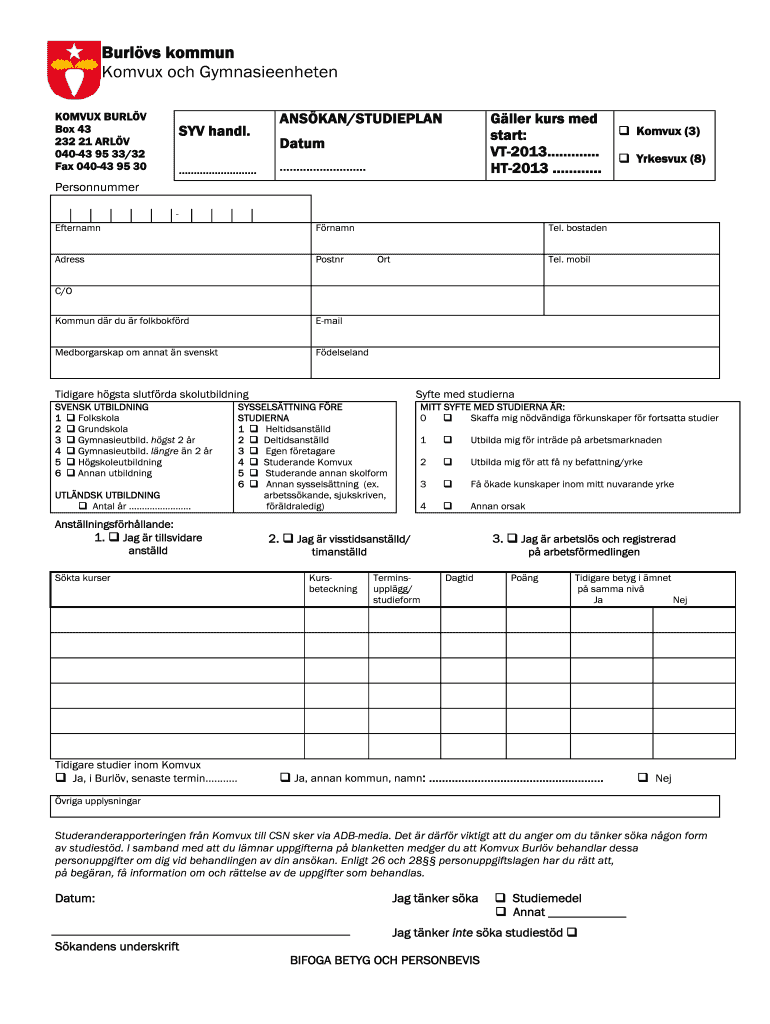 Get the free Burlvs kommun Komvux och Gymnasieenheten - burlovse