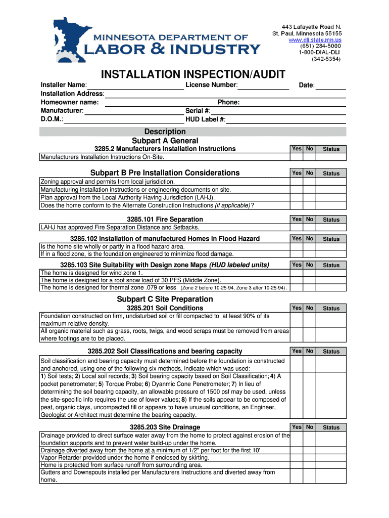 The Manufactured Home Installation Inspection Form is an inspection report template used by installers, homeowners, and inspectors to ensure that the installation of a manufactured home meets safety and construction standards.